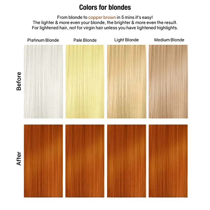 - Brightest results on blonde or brown hair that has lighter bleached or color treated highlights.