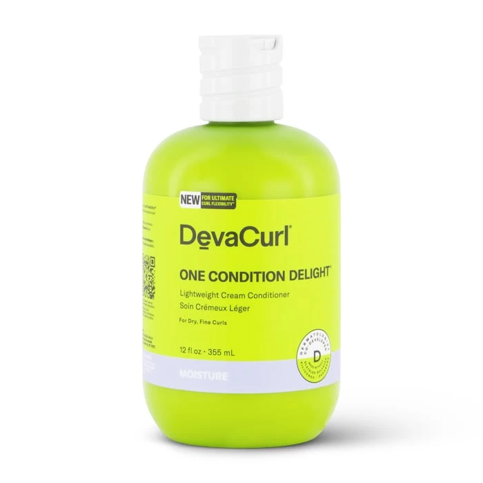 A Lightweight dream Devacurl One Condition Delight Conditioner designed if you have dry, fine curls, this lightweight cream conditioner with a moisture preserving blend hydrates to help fight tangles, control frizz and leave curls feeling soft and defined.