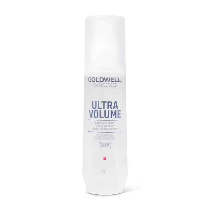 Goldwell Dualsenses Ultra Volume Bodifying spray provides lightweight care to support fullness when styling. Instantly detangles and strengths the hair fibres to protect the hair from heating tools.