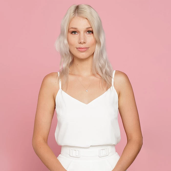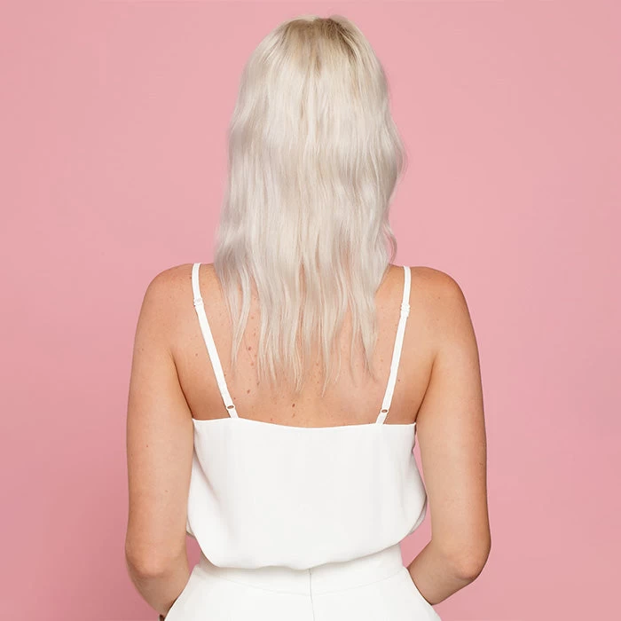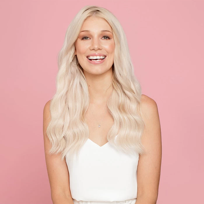 The cool tone twin to Olivia is Emma. Emma is an overall icey platinum blonde with more hints of grey undertones to create an all round ice pearl platinum blonde. This shade has the ability to be toned to appear brighter with a violet shampoo.