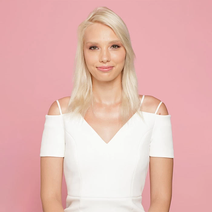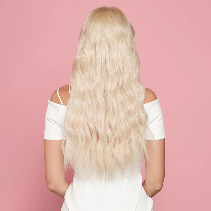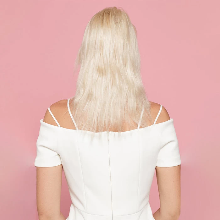 The warm tone twin to Emma is Olivia. Olivia is an overall icey platinum blonde with subtle hints of warm beige pieces intricately fused together. This shade has the ability to be toned to appear brighter with a violet shampoo.