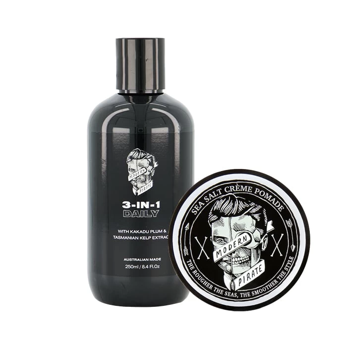 Modern Pirate Creme Pomade + Cleanse Pack contains two incredible products: Modern Pirate Sea Salt Creme Pomade and Modern Pirate 3 In 1 Daily Wash. These work together to create a fresher look from head to toe.