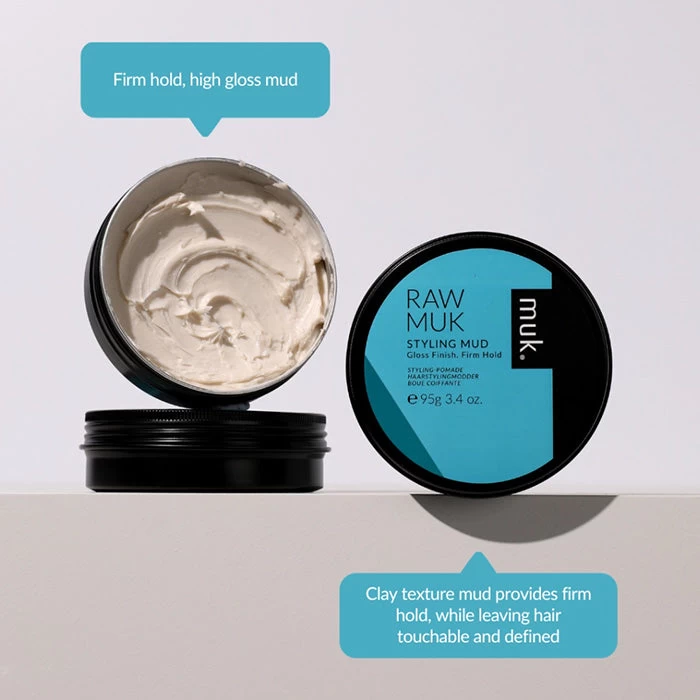 Muk Raw Muk Styling Mud provides a high gloss finish with a firm hold. The non-flaky formula is water soluble, humidity resistant and has a strong yet flexible hold.