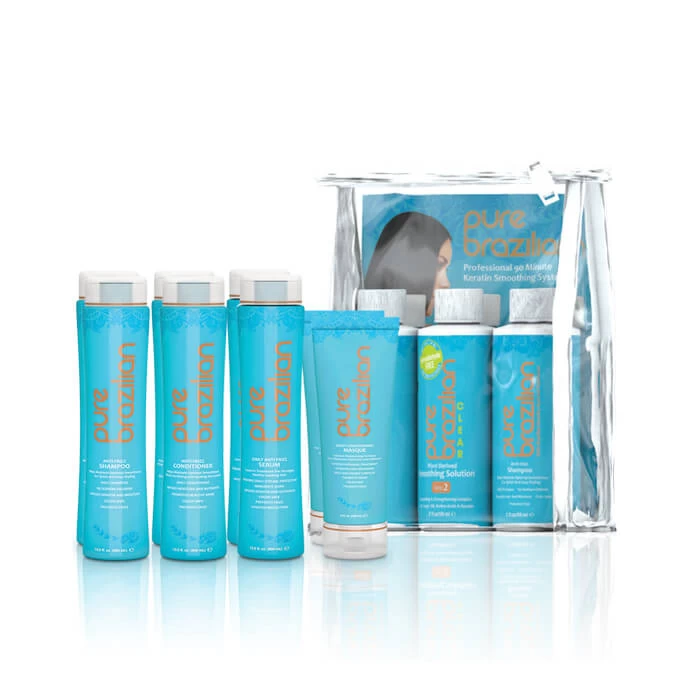 The Pure Brazilian 90 minute, 3-step system is the most advanced and effective professional smoothing treatment available. A perfect alternative for those who are looking for a softer, more voluminous effect than Pure Brazilian’s original solution. This salon-proven plan- derived formula combines essential hair nutrients, fortifying amino acids, Brazilian Keratin along with glyoxylic acid to achieve smooth, frizz-free hair without the use of any harsh chemicals. A unique formula of Brazilian Keratin, Acai, Cocoa Seed Butter, Amino Acids and Super Hair Nutrients help improve the overall condition of the hair.