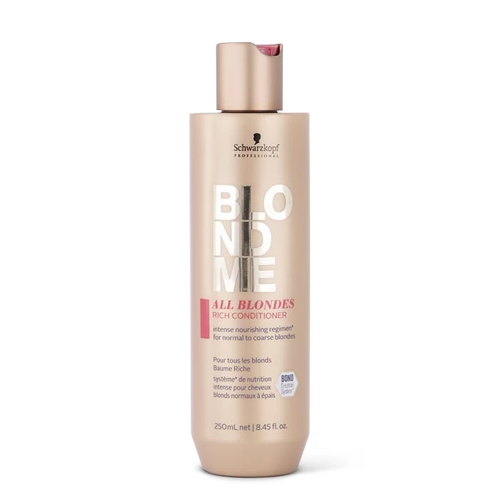Schwarzkopf BlondMe Rich Conditioner with 3D Bond Creation Technology and protein complex from cashmere helps build new fibre bonds while detangling, smoothing and sealing normal to unruly hair types. Helps detangle and strengthens the hair.