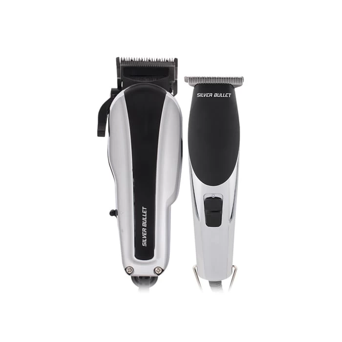 Silver Bullet Dynamic Duo Clipper & Trimmer Set are extremely high-quality hair clippers and hair trimmers for professional barbers. They both have sharp steel blades with zero gaps that make haircuts and hair trimming fast and easy.