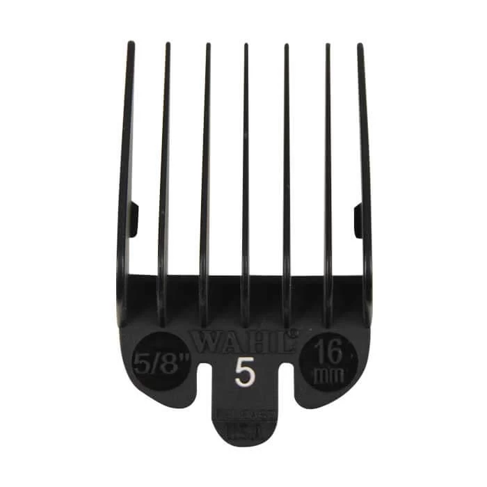 Wahl Clipper Attachment Guides Size #5 is part of the Wahl clipper attachment guide combs series with a 5/8″ or 16mm plastic size. It has a secure grip that ensures that it does not slip off from the clipper blades while in use. It has rounded edges that make passage through hair smoother, giving the client a comfortable feel while receiving the service. The Wahl clipper guard attachments stay firmly secured to the blade and are designed to last long.